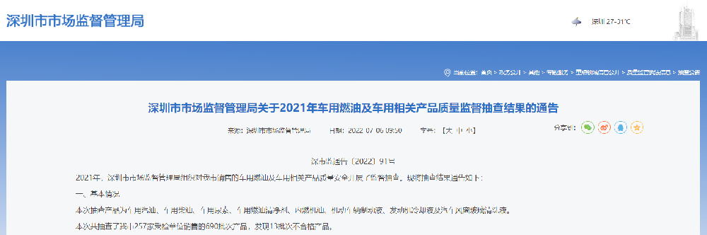 中国质量新闻网讯2022年7月6日,深圳市市场监督管理局网站通告2021年车用燃油及车用相关产品质量监督抽查结果。本次抽查产品为车用汽油、车用柴油、车用尿素、车用燃油清净剂、内燃机油、机动车辆制动液、发动机冷却液及汽车风窗玻璃清洗液,共抽查了深圳市257家受检单位销售的690批次产品,发现13批次不...